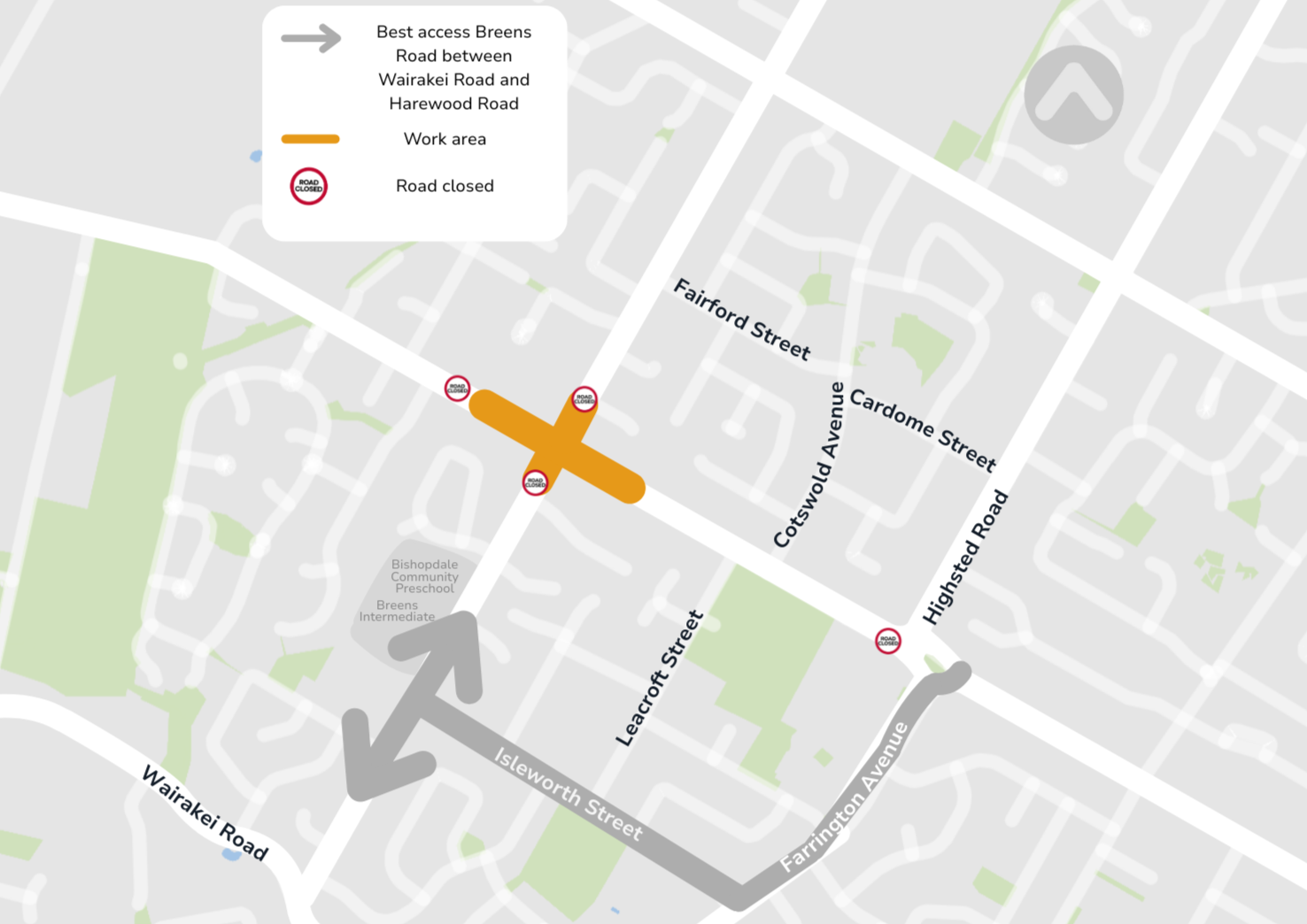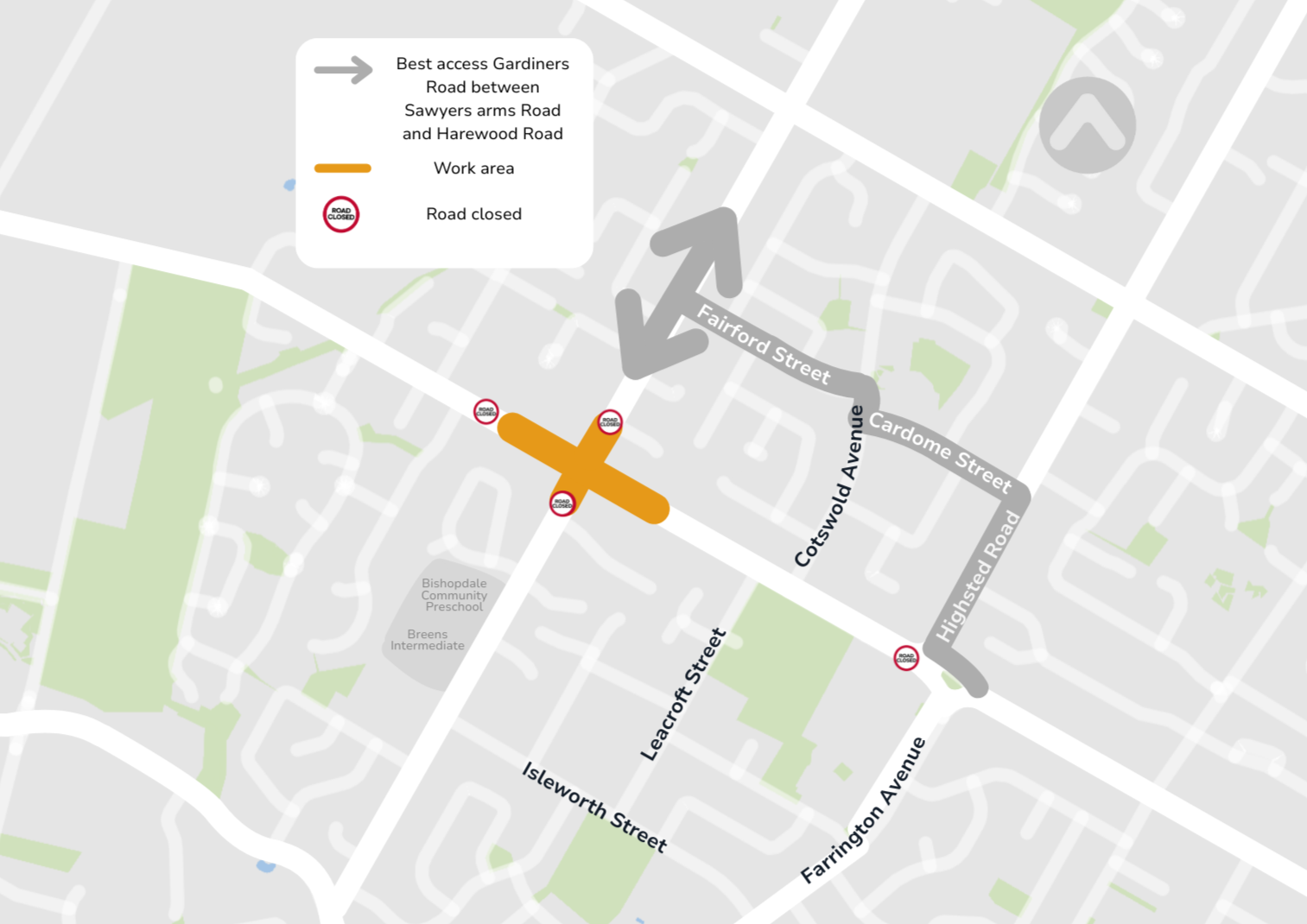 There'll be no access through the intersection of Harewood Road, Gardiners Road and Breens Road. Best access to Crofton Road is via Highsted Road and Sawyers Arms Road. Best access to Wooldridge Road is via Farrington Avenue and Wairakei Road.