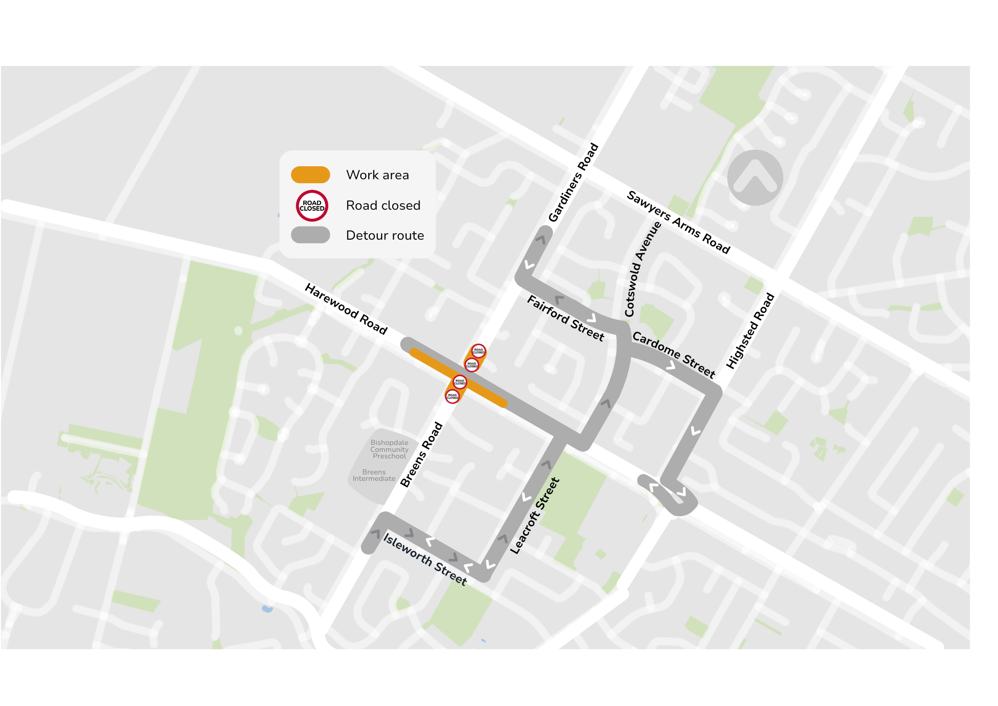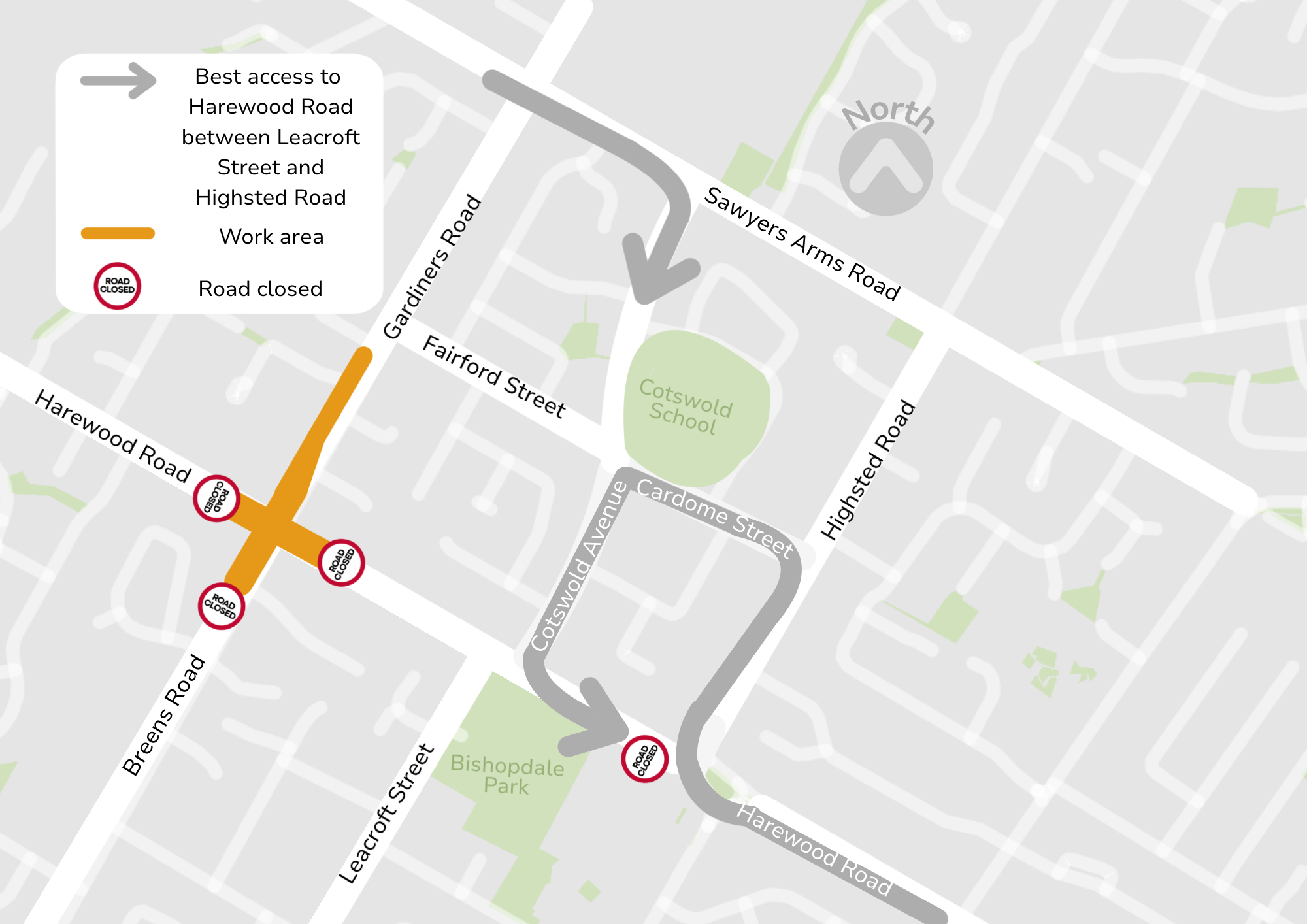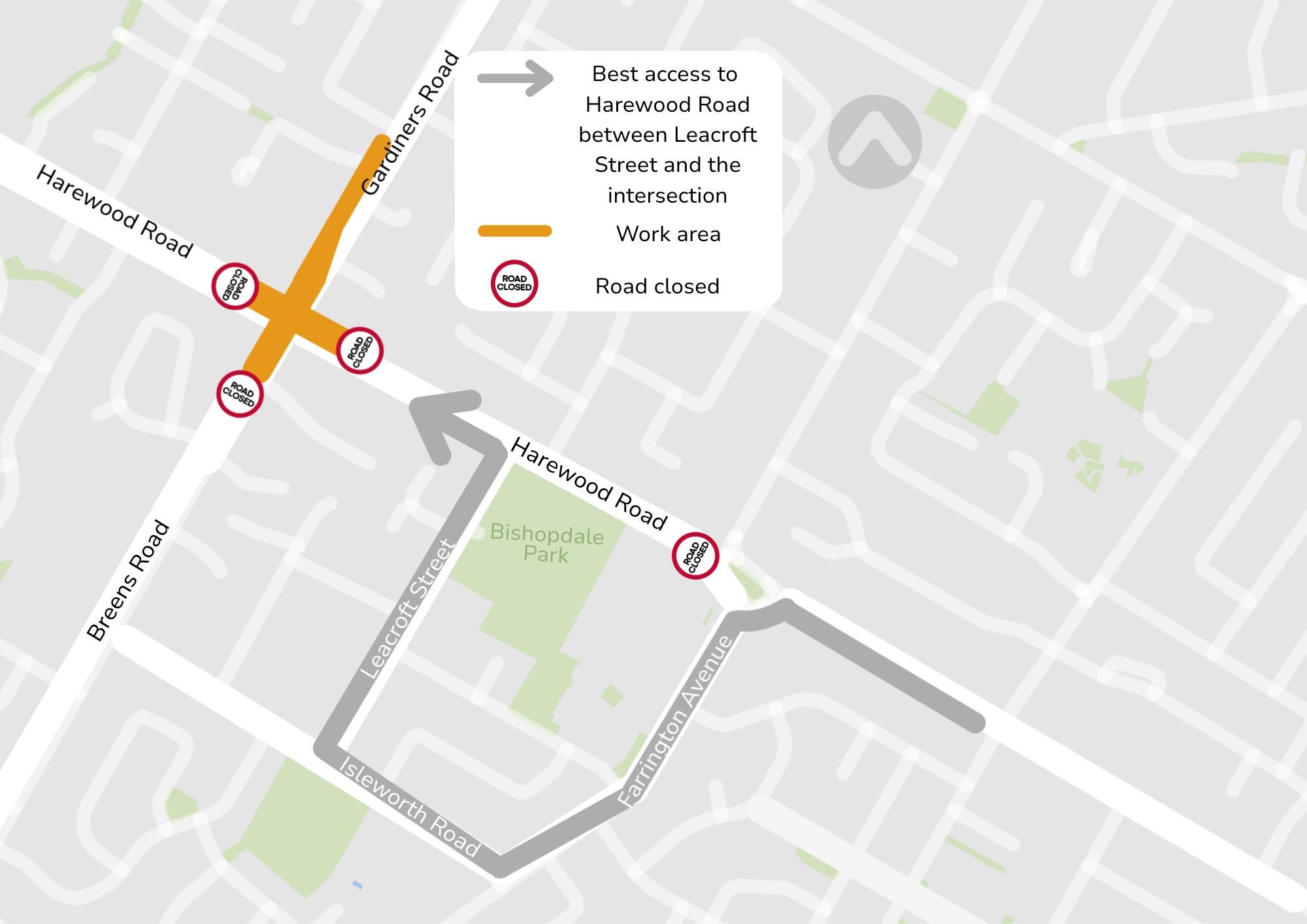 Vehicles will be detoured at the intersection of Farrington Avenue, Harewood Road and Highsted Road. Best access to Leacroft Street is via Farrington Avenue and Isleworth Road.