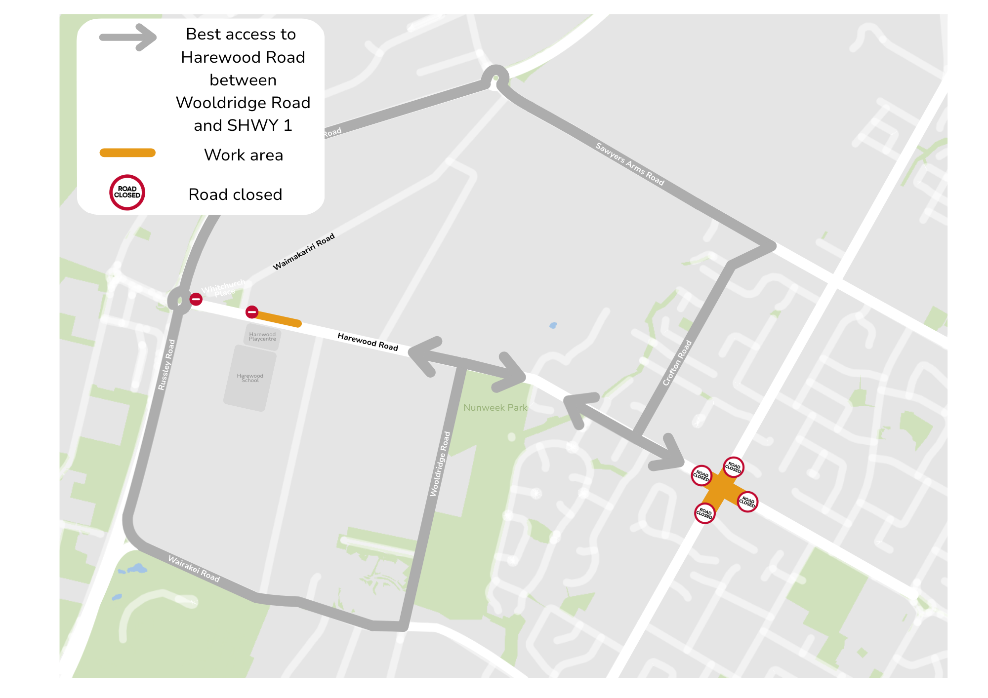 There'll be no access through the intersection of Harewood Road, Breens Road and Gardiners Road. Best access to Crofton Road is via Highsted Road and Sawyers Arms Road. Best access to Wooldridge Road is via Farrington Avenue and Wairakei Road.