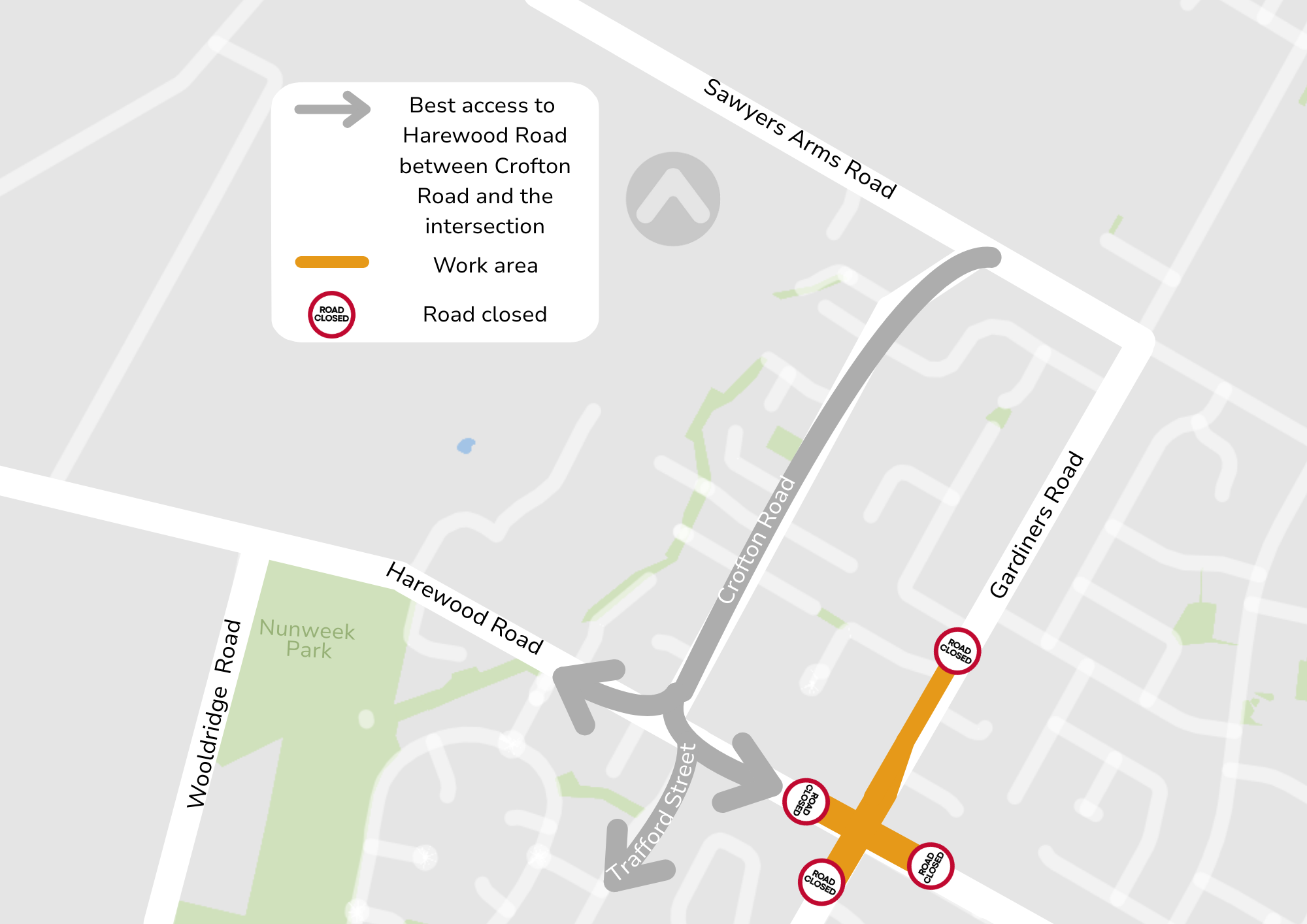 Over super week (4-12 Jan), if you access your property from Gardiners Road between Harewood Road and Sawyers Arms Road, you’ll need to approach from Sawyers Arms Road or Fairford Street.
